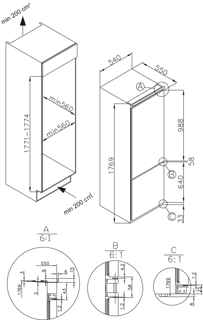 - Nische (HxBxT): 1771-1774 x 560 x 560 mm